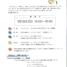 みなさまこんにちは。今年もいよいよ残すところ1か月をきりました。 本当に早いものですね! さて1月のシングルマザー・グループ相談会のお知らせです。 シ…